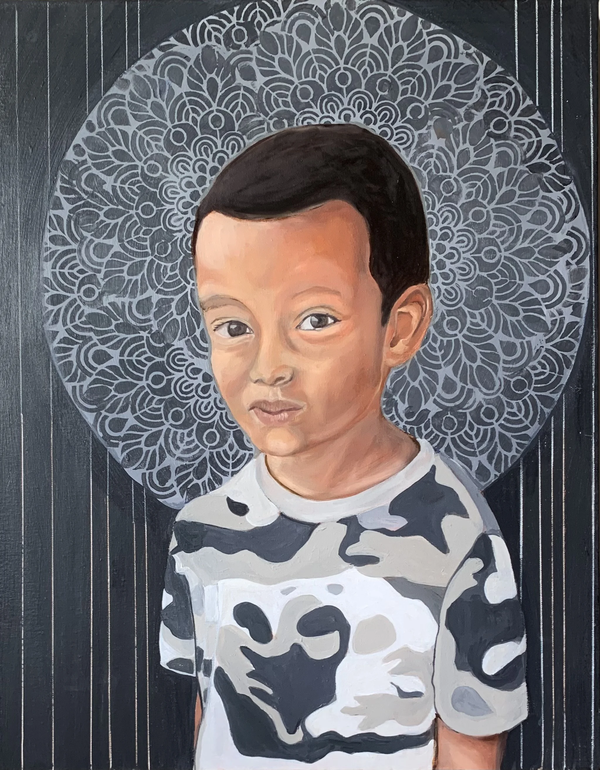 Little Boy with Butterflies, 2021, 32.2”x24.25,” Acrylic, collage on a wooden panel